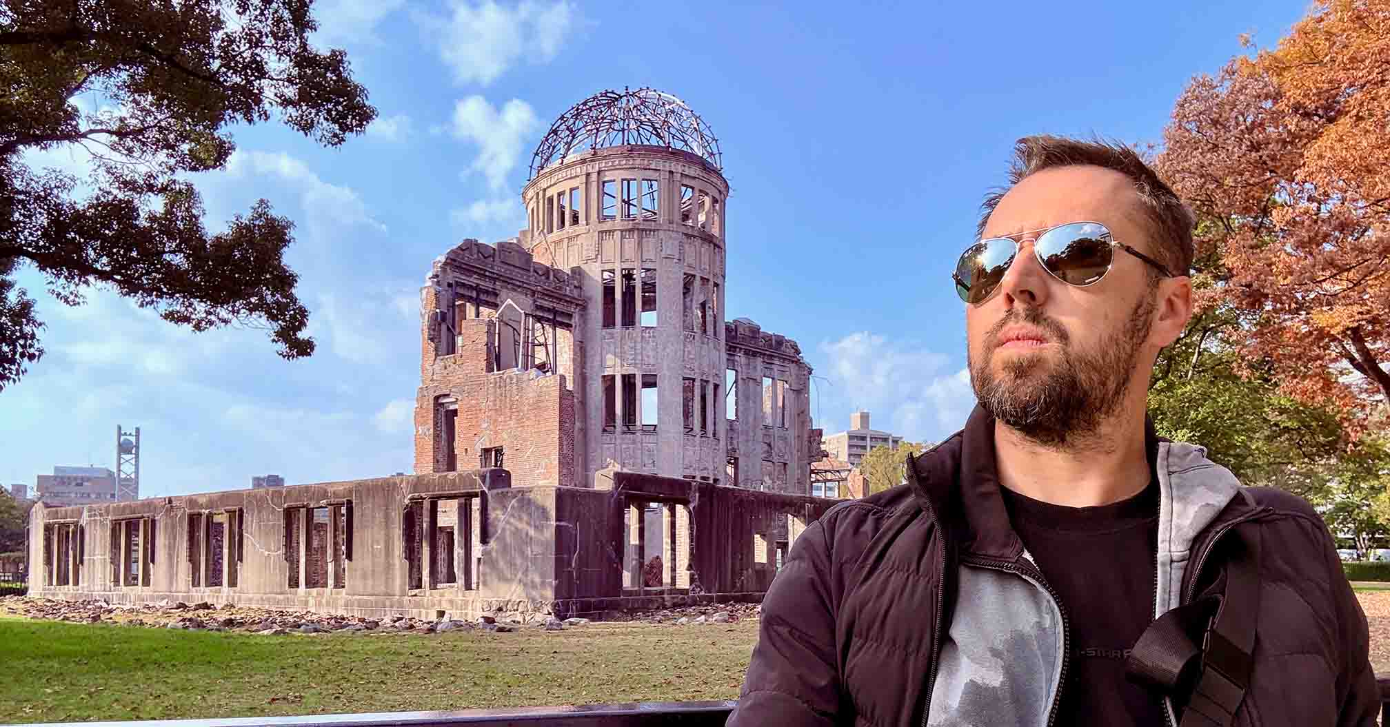 Itt vagyunk Hirosimában, az atombomba epicentrumában, az Atombomba Dóm mellett. Az atombomba körülbelül 600 méterrel e terület felett robbant fel. Körülbelül 70 000 ember halt meg azonnal, és 1945 végére a halálos áldozatok száma megközelítőleg megduplázódott. Ezt az épületet 1915-ben fejezték be, körülbelül 30 évvel a bombázás előtt, és egy cseh építész tervezte. Még mindig áll, mert az ütőhullámok úgy érték, hogy a betonváz nem dőlt össze teljesen.